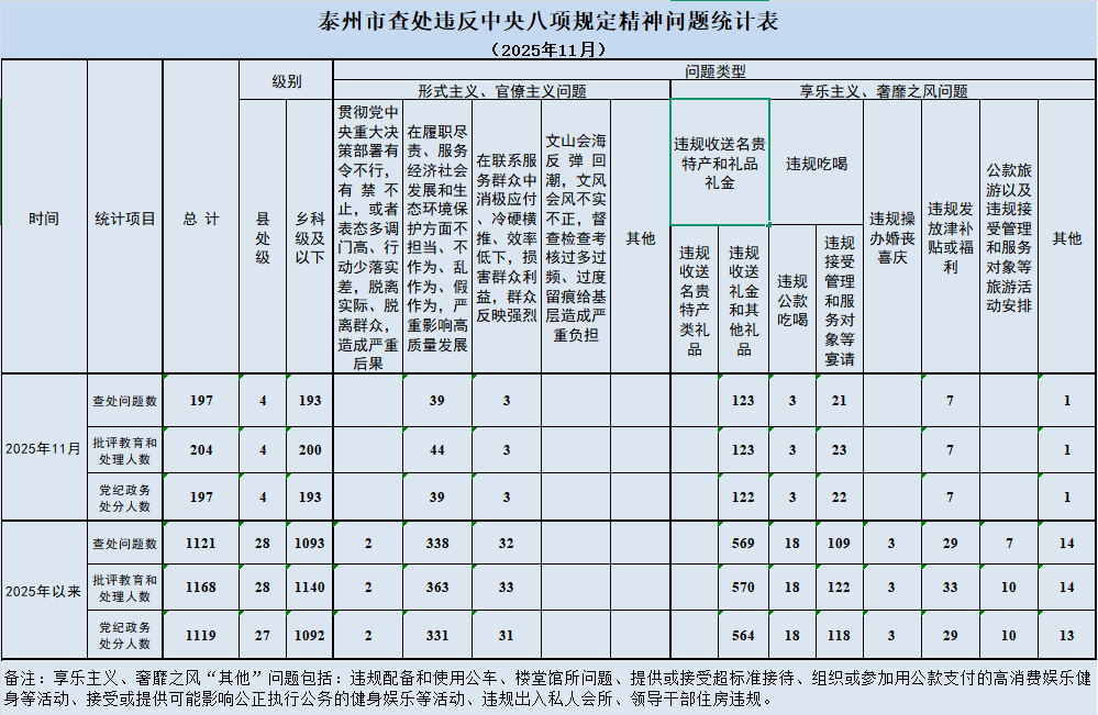 2025年11月,全市共查处违反中央八项规定精神问题197起,批评教育和处理204人、其中给予党纪政务处分197人。从问题类型看,查处形式主义、官僚主义问题42起、批评教育和处理47人,查处享乐主义、奢靡之风问题155起、批评教育和处理157人。从人员级别看,批评教育和处理县处级干部4人、乡科级及以下人员193人。