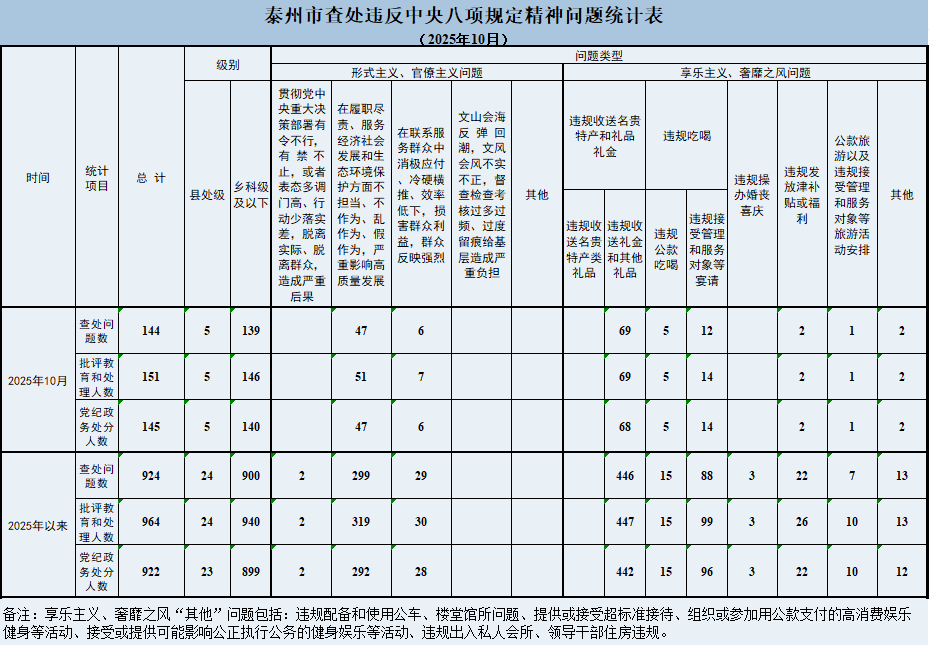 2025年10月,全市共查处违反中央八项规定精神问题144起,批评教育和处理151人、其中给予党纪政务处分145人。从问题类型看,查处形式主义、官僚主义问题53起、批评教育和处理58人,查处享乐主义、奢靡之风问题91起、批评教育和处理93人。从人员级别看,批评教育和处理县处级干部5人、乡科级及以下人员146人。