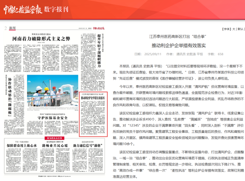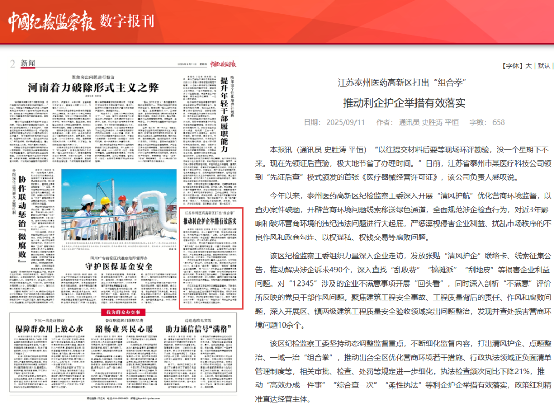 今年以来,泰州医药高新区纪检监察工委深入开展“清风护航”优化营商环境监督,以查办案件破题,开辟营商环境问题线索移送绿色通道,全面规范涉企检查行为,对近3年影响和破坏营商环境的违纪违法问题进行大起底,严惩漠视侵害企业利益、扰乱市场秩序的不良作风和政商勾连、以权谋私、权钱交易等腐败问题。
