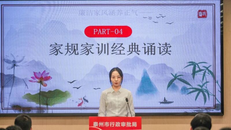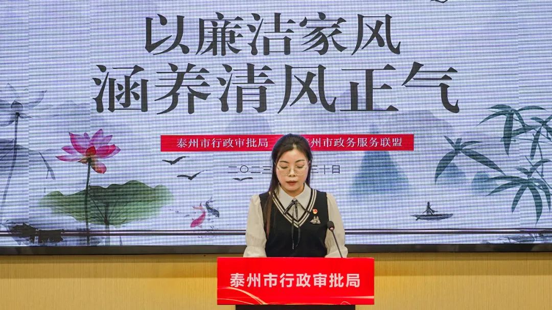 活动最后,市行政审批局党组书记、局长焦斐虎分别为家属代表和政务服务联盟党支部赠送了廉洁家风书籍,并向全局干部职工家庭发出廉洁倡议:常吹家庭廉政风、常敲家庭廉政鼓、把好家庭廉政关、守住家庭幸福门,推动全面从严治党向纵深发展,为建设“强富美高”现代化新泰州增光添彩。